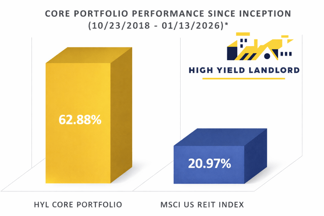 This approach has proven highly successful for me — so much so that I eventually chose to leave my career in private equity real estate to focus entirely on REIT investing. In late 2018, I launched the Core Portfolio of High Yield Landlord, and despite REITs facing a quasi-bear market for much of the past five years, it has still delivered a 63% total return. That performance is particularly impressive given the challenging backdrop: rising interest rates, valuation compression, and sector-wide underperformance have weighed heavily on listed real estate.