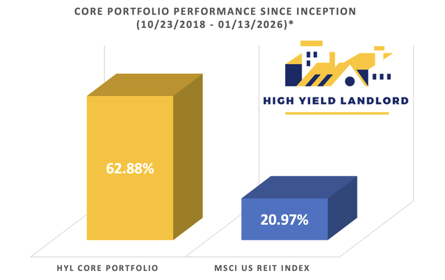 This approach has proven highly successful for me — so much so that I eventually chose to leave my career in private equity real estate to focus entirely on REIT investing. In late 2018, I launched the Core Portfolio of High Yield Landlord, and despite REITs facing a quasi-bear market for much of the past five years, it has still delivered a 63% total return. That performance is particularly impressive given the challenging backdrop: rising interest rates, valuation compression, and sector-wide underperformance have weighed heavily on listed real estate.