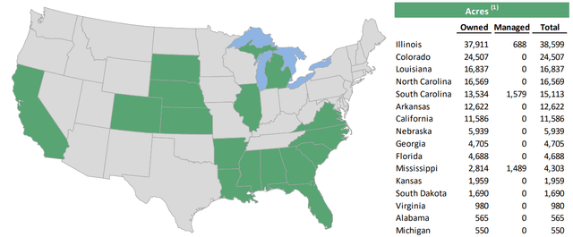 Farmland Partners (FPI) is our favorite farmland investment opportunity that's available on the public market. It is the largest farmland REIT by acreage, owning over 160,000 acres of farmland across the US: