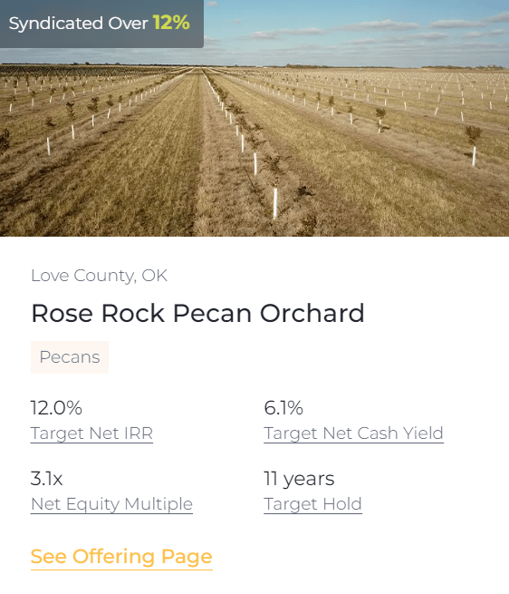 Typically, their deals enjoy far higher yields than what you would get from public farmland REITs because you are not paying a large premium to NAV, the fees are reasonable, and most importantly, FarmTogether typically structures deals that prioritize income generation.