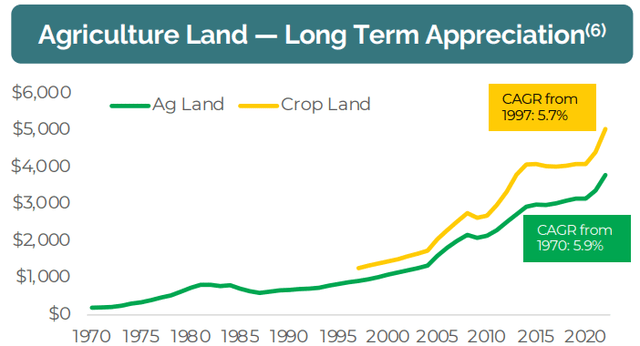 FPI owns mainly high-quality farmland so its portfolio has likely appreciated even more than that. FPI is also leveraged so the impact on its equity value is amplified. Farmland is also expected to keep growing in value in 2023 and the CEO has guided for its portfolio to appreciate by 5-6% per year on average over the coming decade. This is roughly in line with historic averages: