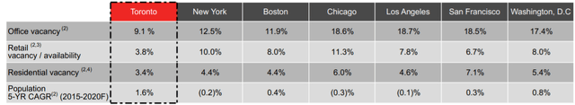 To give you an example, here is how Toronto compares to other major US cities in terms of vacancies and expected future growth: