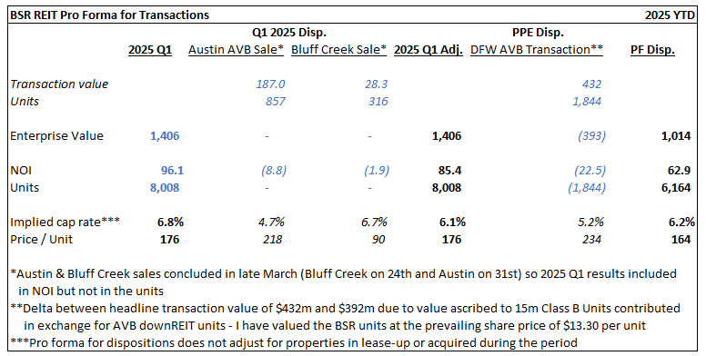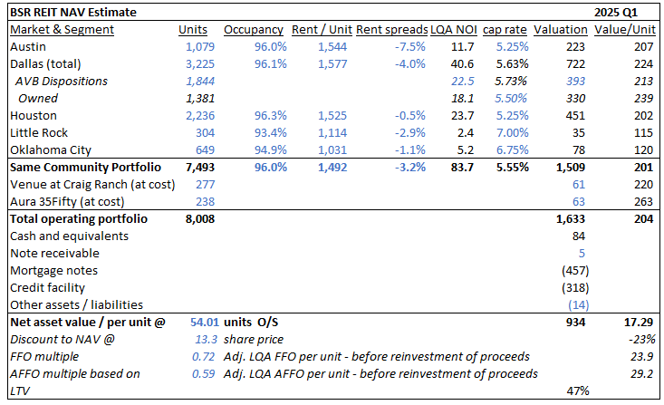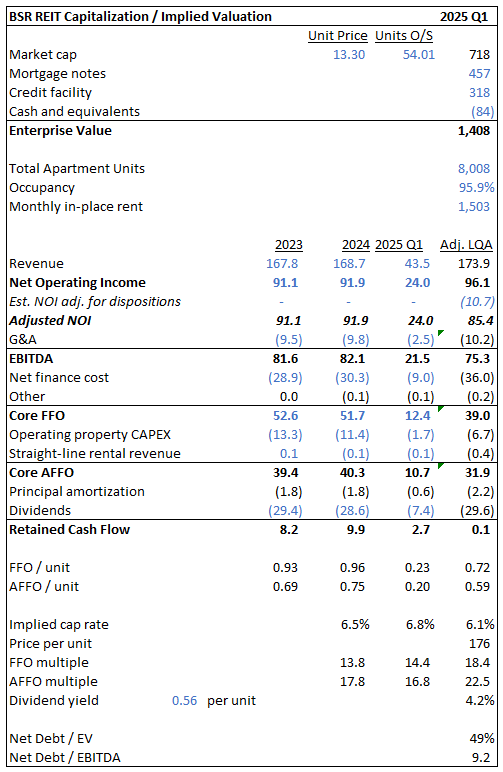 At $13.30 per unit, BSR trades at an implied cap rate of 6.1% based on 2025 Q1 NOI adjusted for the Austin and Bluff Creek dispositions, which completed at the end of the quarter. The implied price per unit is $176k with FFO multiples of 18x and 22x (again adjusted for the sales during the quarter). They pay a monthly dividend that results in a 4.2% yield.