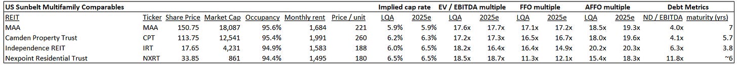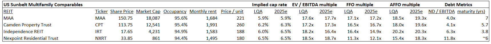 US sunbelt multifamily peers trade at 6% - 6.5% implied cap rates and 18x - 20x AFFO. The implied valuation per unit is where BSR REIT stands out as it trades at a discount to even Nexpoint Residential Trust, which focuses on value-add Class B properties and operates with high leverage compared to the peer set and a 20% - 30% discount to the “blue chip” REITs in the space - MAA & Camden Property Trust.
