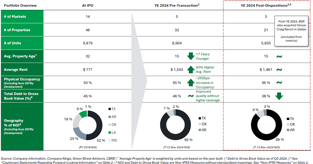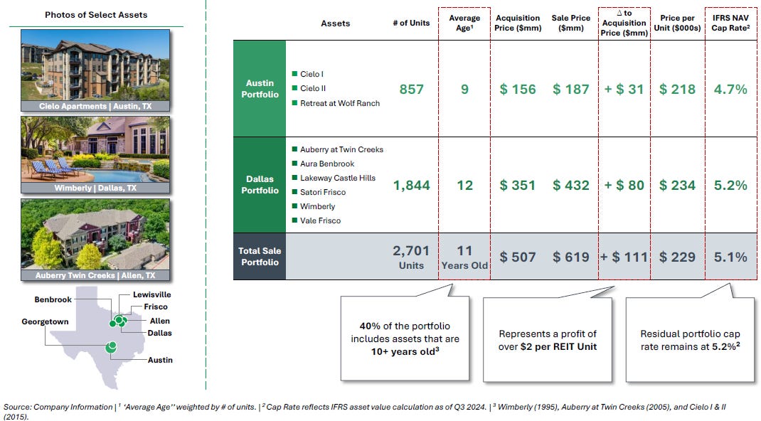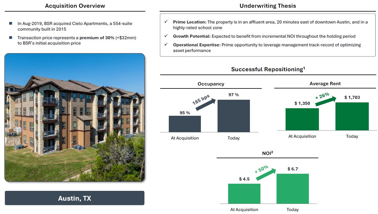 In February 2025, BSR REIT agreed to sell a 9-property portfolio (3 in Austin, 6 in Dallas) in a significant $618.5m transaction to one of the largest multifamily apartments REITs in the US - AvalonBay Communities. This was a significant transaction for BSR, representing about 1/3 of the REIT based on gross asset value.