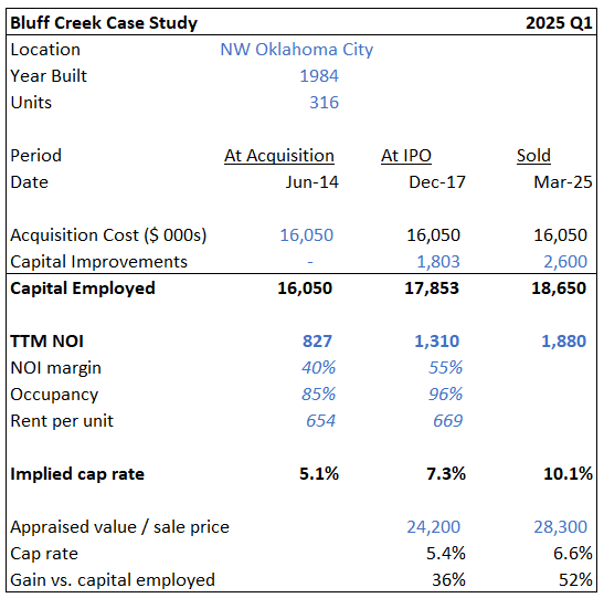 BSR also sold a property in the Oklahoma City MSA in Q1 that provides another good “round trip” case study we can use to evaluate managements ability to add value as it was also featured in their 2018 IPO prospectus. BSR acquired the property in 2014 for $16m and implemented a $2.6m capital improvement program to renovate units and common areas, $1.8m of which was complete by the 2018 IPO.