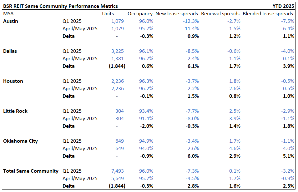 So far in 2025, BSR’s portfolio has managed to maintain relatively high occupancy and there has been some sequential improvement in lease spreads in April / May 2025 compared to Q1. Notably, blended spreads turned positive in Houston and Oklahoma City and show signs of stabilizing in Dallas / Fort Worth. New lease spreads remain negative in every market except for OKC.