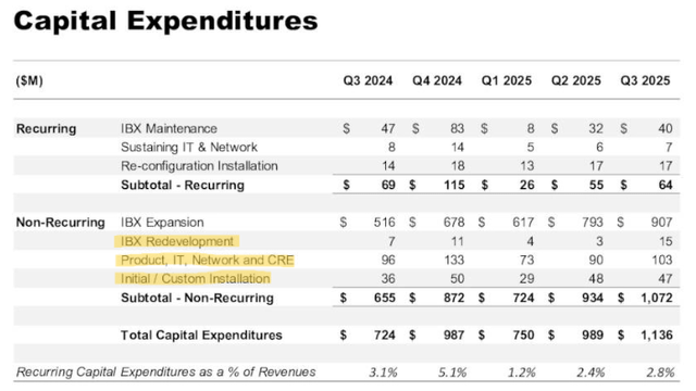 While expansion of “International Business Exchange” facilities (i.e. EQIX’s interconnection data centers) is clearly revenue-generating capex, much of what is categorized as IBX redevelopment; product, IT, network and CRE; and initial/custom installation is almost certainly not revenue-generating.