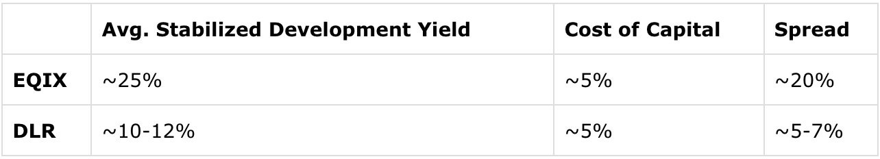 On the other hand, one of Dane Bowler’s arguments for the superiority of EQIX over DLR is its wider development spreads.