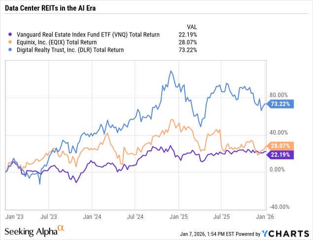 In fact, astonishingly, in the last three years, EQIX has barely outperformed the real estate sector as a whole (VNQ).