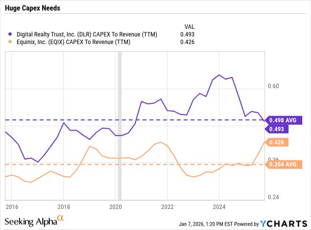 Over the last decade, the capex-to-revenue ratios for both EQIX and DLR have trended upward: