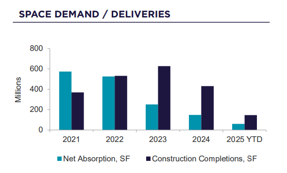 Before 2025, demand for industrial space was already decelerating as a result of slowing job growth, soft consumer spending, and muted business investment. Then, in the first half of 2025, an aggressive and chaotic series of tariff rate changes and trade negotiations caused industrial demand to decelerate further.