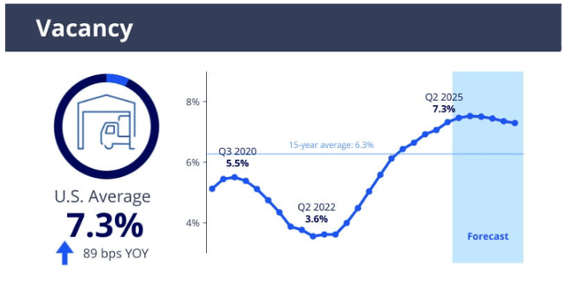 That has caused the industrial vacancy rate to ascend from a sub-4% level in 2022 to somewhere between 7.0% and 7.5% as of midyear 2025. This is having predictable effects on industrial real estate, including the lowest increase in asking rent (2.6% in Q2 2025) since Q1 2020.