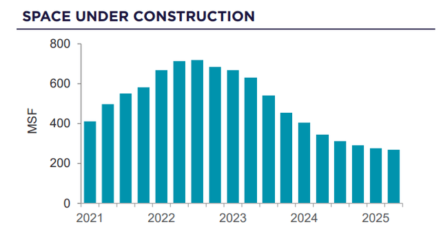 On the other hand, resulting from the drop in tenant demand as well as higher interest rates and construction costs, the development pipeline has shrunk considerably as starts fall off. According to JLL, the industrial real estate development pipeline is the lowest it has been since Q3 2016.