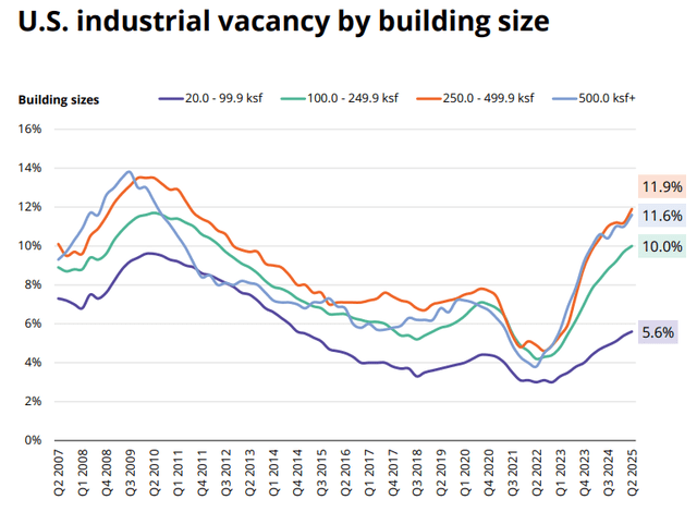 Another interesting point to note, as we have in previous earnings updates, is that industrial vacancy is highly bifurcated between large and small buildings. Most of the recent construction has been of large buildings, which is why the large building vacancy rate has increased far more and at a faster pace than for smaller buildings.