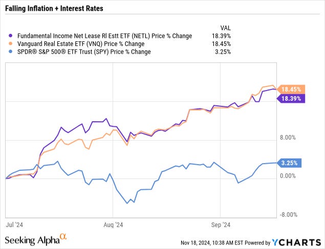When the June CPI report came in showing a marked disinflationary trend, all REITs (VNQ), including net lease REITs (NETL), began to dramatically outperform the market: