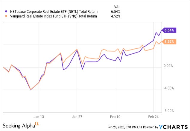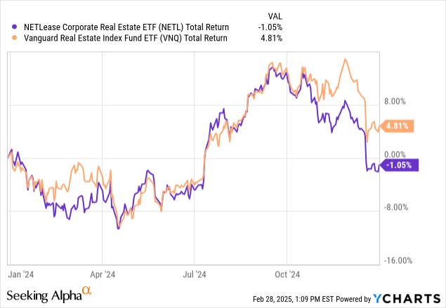 Here's how net lease REITs (NETL) performed over the course of 2024 compared to the broader real estate index (VNQ):