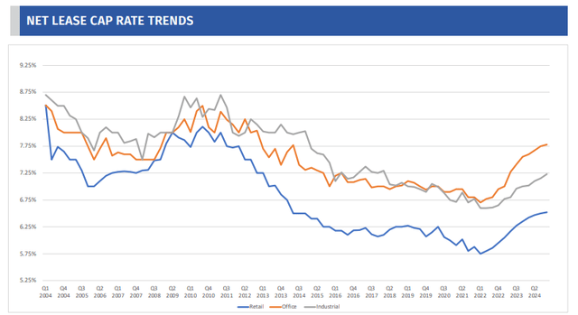 On that last point, note that net lease cap rates are the highest they've been in over a decade for retail and office while being the highest since 2017 for industrial.