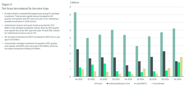 While net lease REITs cooled their investment volume somewhat over the first few quarters of 2024 as their cost of capital remained elevated, they returned in Q4 with their highest acquisition volume in years.