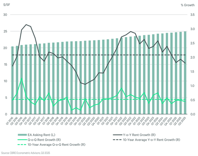 But rent growth has actually been gradually softening since its post-pandemic peak in 2022: