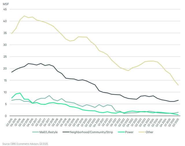 Virtually zero new malls or power centers are being built today, while construction of shopping centers remains near its lowest point in a decade and development of freestanding retail buildings appears to be collapsing.