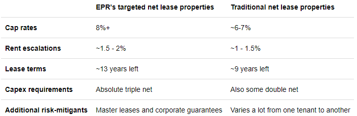 But this is a great opportunity for EPR because it has left a clear void for capital in this segment of the net lease market and it has allowed EPR to earn above-average risk-adjusted returns by buying these properties at cheap prices and then structuring strong leases and including them as part of a well-diversified portfolio to mitigate risks.