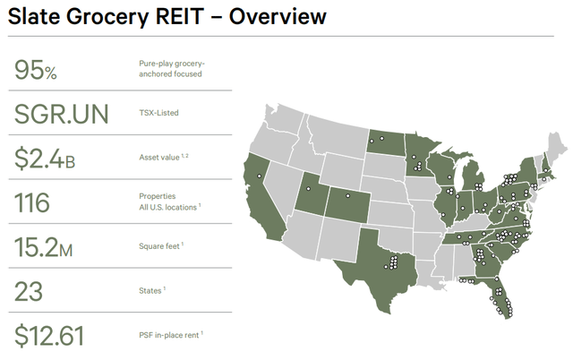Slate Grocery REIT is a unique and little-known REIT. It trades on the Toronto Stock Exchange and only over-the-counter in the US, but 100% of its properties are located in the US, making it akin to BSR REIT (BSRTF).