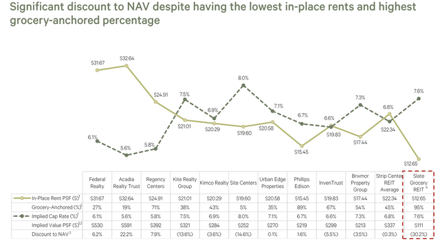 Slate Grocery REIT highlights the fact that their stock is valued very cheaply even while their in-place rents per square foot are very low.