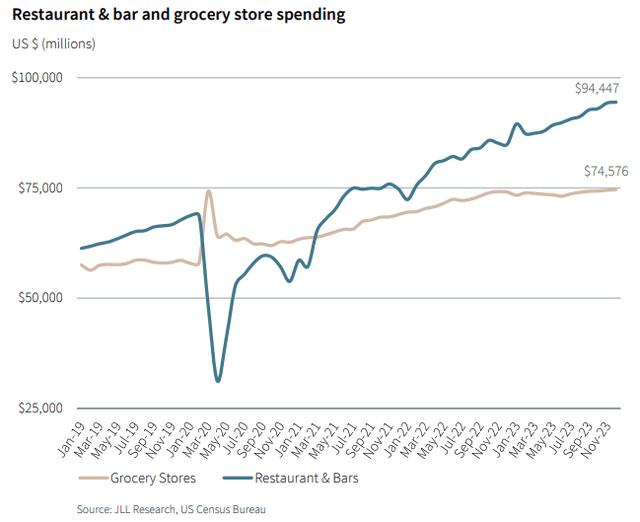 Although consumer spending at restaurants & bars has grown far faster than at grocery stores in the post-COVID era, this is not as disappointing for grocery-anchored centers as it may seem, as grocery-anchored centers also sometimes feature restaurants and bars within their main building or in outparcels in the parking lot.
