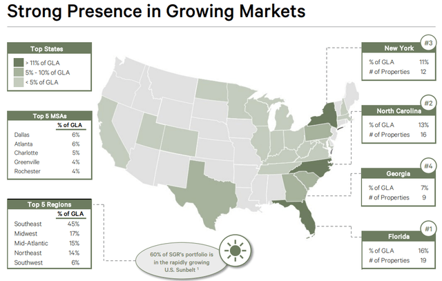 As you can see above, the vast majority of Slate's portfolio is located in the Eastern half of the United States. About 60% of Slate's portfolio is concentrated in Sunbelt states, with Florida accounting for the largest share of GLA at 16% and Dallas the single largest market at 6%.