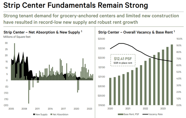 Notice in that left-hand chart that, aside from brief periods in 2011, 2017, and 2020, net absorption of retail space in strip centers has been meaningfully higher than new supply being delivered. The natural result of this has been falling vacancy rates and rising rents, as you can see on the right-hand chart.
