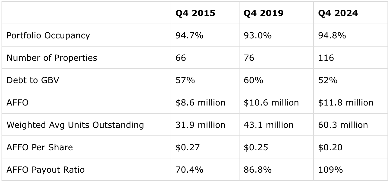 - AFFO per share has gradually declined over time while the dividend has stayed basically flat, resulting in a rising payout ratio. As of Q4 2024, the AFFO payout ratio reached 109% (!!).