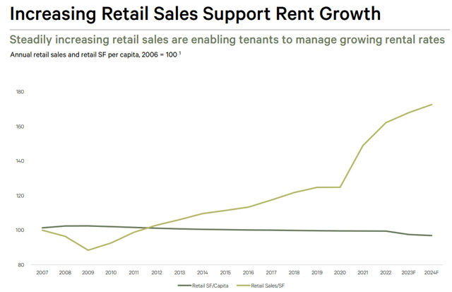 But whether retail spending is in essential goods or discretionary goods, steadily rising retail sales is definitely supportive of retail real estate and enables retailers to pay higher rents over time.