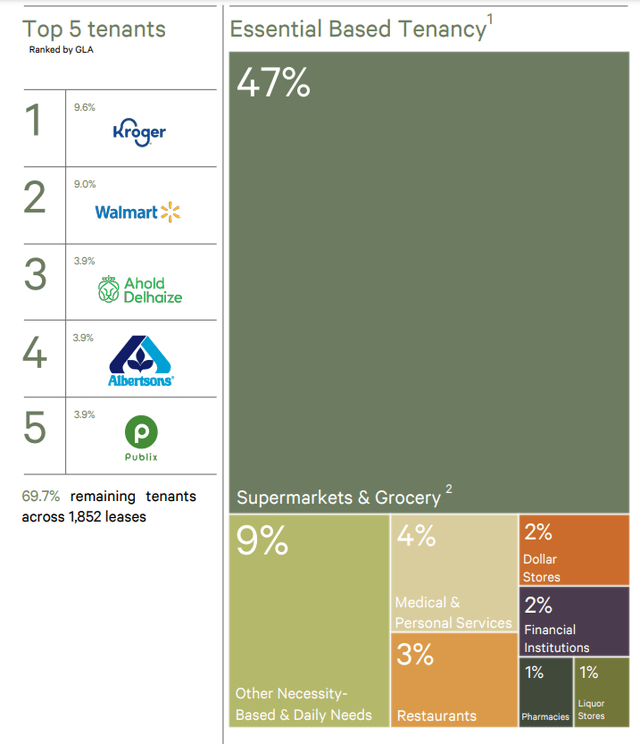 Almost half of Slate's gross leasable area consists of grocery stores and supermarkets, while another 9% are other necessity-based retailers.