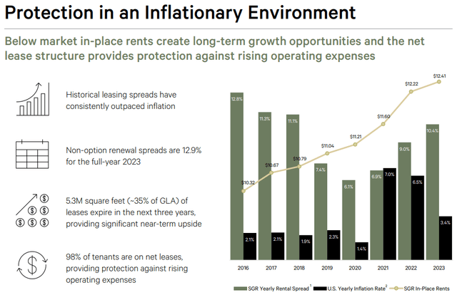 That's exactly what we see with Slate. The REIT reported lease renewal spreads for non-option tenant renewals of ~13% for the full year of 2023. Including option periods, Slate's spreads on total leasing in 2023 was slightly over 10%.