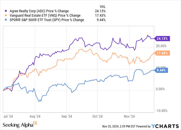 Since the major shift in macroeconomic outlook at the beginning of July from Fed tightening / "higher for longer" to continued disinflation / Fed loosening, the stock price of Agree Realty Corporation (ADC) has outperformed both the real estate index (VNQ) and the S&P 500 (SPY):