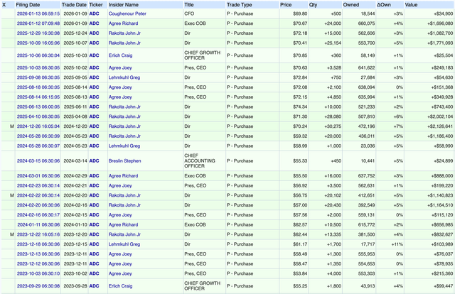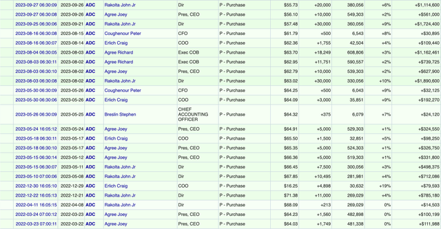 This is also very well reflected in them putting their money where their mouth is. Company insiders have bought $10s of millions worth of stocks in recent years. This includes Joey Agree and his father buying millions, and never selling a share, despite already having the bulk of their net worth invested in the stock, and their compensation plan heavily depending on its performance.