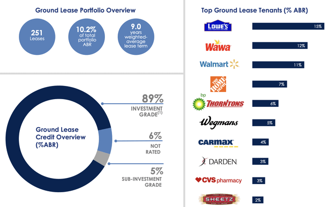 Many investors forget that Agree Realty today earns 10.2% of its rental income from ground lease properties with just about 8.8 years left on its leases on average: