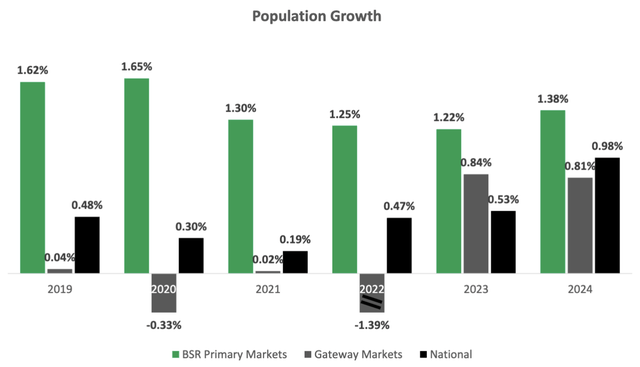 It owns affordable garden-style apartment communities in the famous Texan Triangle - Dallas, Austin, and Houston - which enjoys some of the fastest job and population growth in the nation. Over the long term, this unique focus has enabled BSR to grow its FFO and NAV per share at the fastest pace among its peer group.