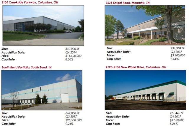 PLYM follows a unique approach that we believe to be set for long term outperformance (bearing they can handle their high leverage and meet guidance). Rather than target richly priced Class A assets at 4-5.5% cap rates – PLYM targets smaller Class B and C properties in secondary markets. These assets are riskier, but they also come with near double-digit cap rates and releasing spreads have been fairly comparable to Class A peers. Here are a few examples of the type of properties that they like to target: