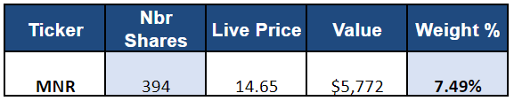 MNR is currently our Top Pick among industrial REITs and we own an outsized position at 7.5% of our Core Portfolio:
