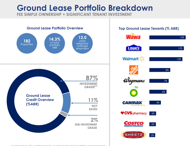 Third, ADC's ground leases are overwhelmingly tenanted by investment-grade retailers, making them akin to a BBB bond proxy with organic rent growth of around 1%.