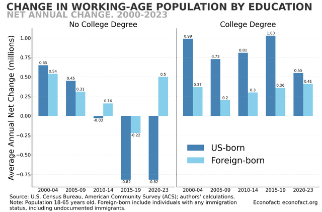 But by the mid-2010s, as you can see above, that lead to a decline in the non-college educated native-born working-age population.
