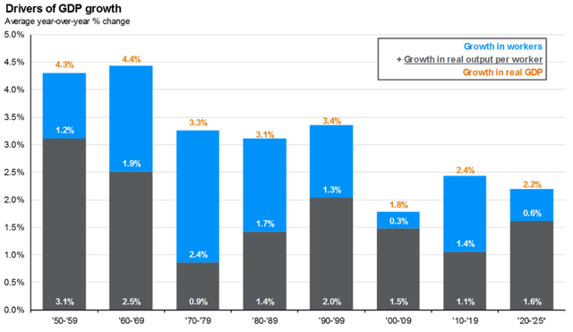 We've seen this in various economic projections, including from the Federal Reserve. Real GDP growth will face strong headwinds from a sharp reduction in the growth of the US labor force and population. And this is to say nothing about the growth-stunting effects of tariffs on top of that!