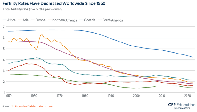 We won't get into the reasons why the birth rate has declined so much in the last half-century or so, but suffice it to say: it has. In most parts of the world, especially the developed world, the birth rate is under the replacement rate of about 2 kids per couple.