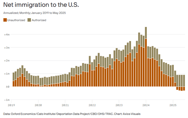 Likewise, in a July 2025 report titled "Immigration Policy and Its Macroeconomic Effects in the Second Trump Administration," economists from the American Enterprise Institute and Brookings Institution estimate that net immigration into the US (including authorized and unauthorized) in 2025 will be between -525,000 and 115,000. They project net immigration numbers to be even lower in 2026, almost certainly ending up in the negatives.