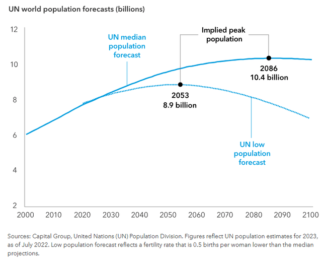 Note that a peak population of about 8.9 billion people 30-ish years from now would represent growth of only about 8.5% from the currently estimated 8.2 billion people on Earth.