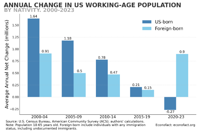 If not for net immigration, the working-age population in the US would already be on the decline. The native-born American population is aging quickly, with the last few years of the large Baby Boomer generation soon to reach age 65.