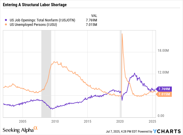 Then in the late-2010s, that situation flipped. Since about 2017 (outside of the idiosyncratic COVID pandemic), job openings have remained consistently higher than the total number of unemployed people.