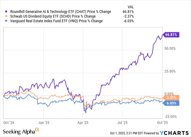 And in the stock market, it is hard not to notice that AI-related stocks (CHAT) are absolutely trouncing everything else, especially income-oriented investments like dividend stocks (SCHD) and REITs (VNQ):
